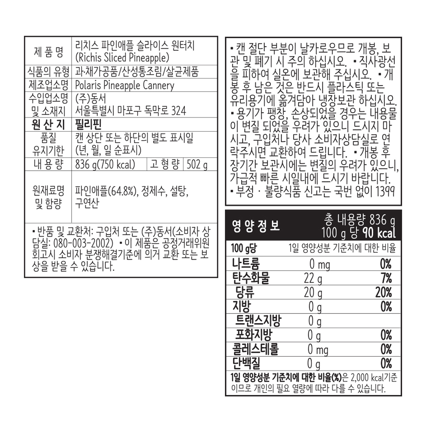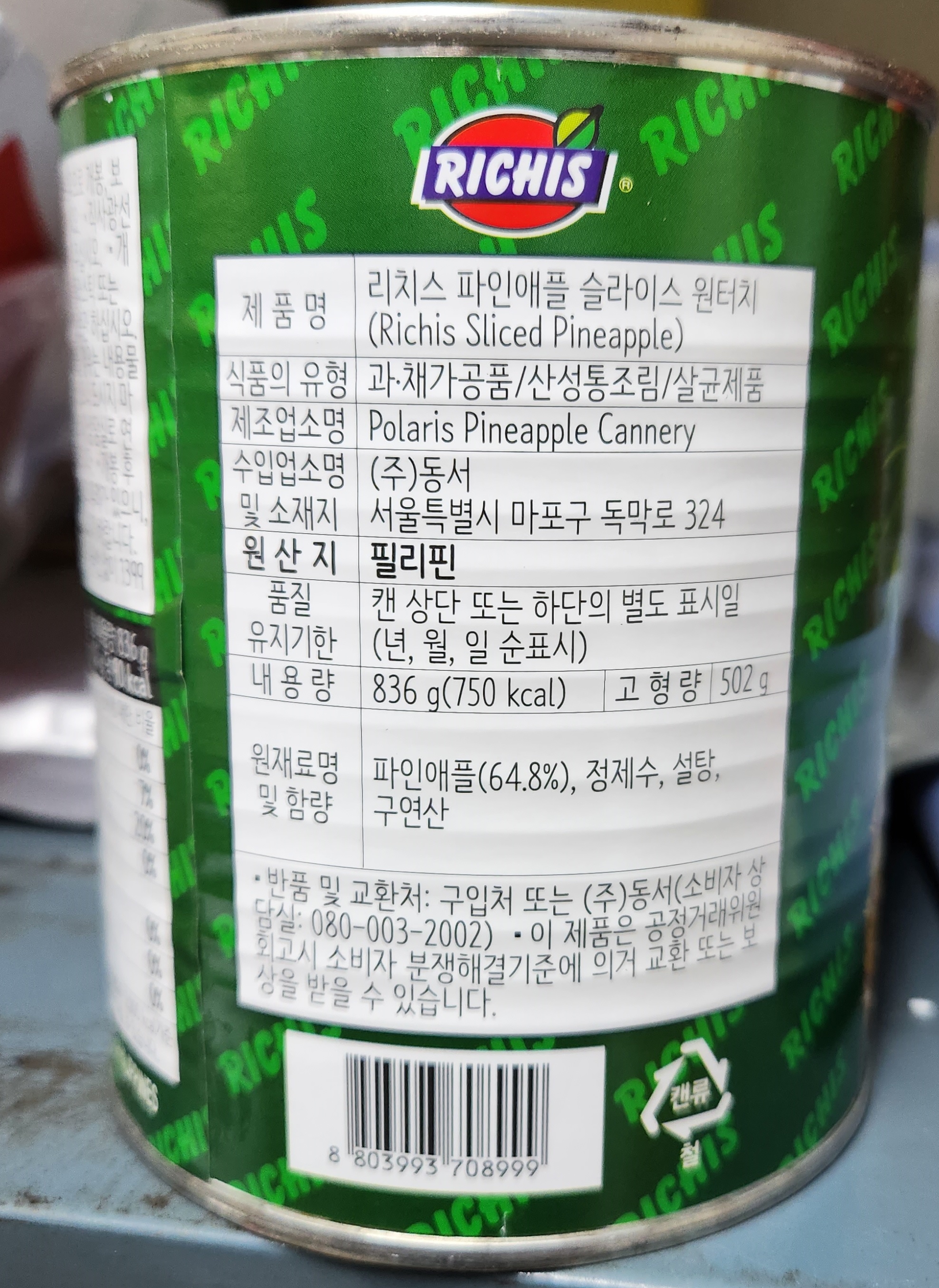리치스 파인애플캔(슬라이스 836g/EA) 이미지