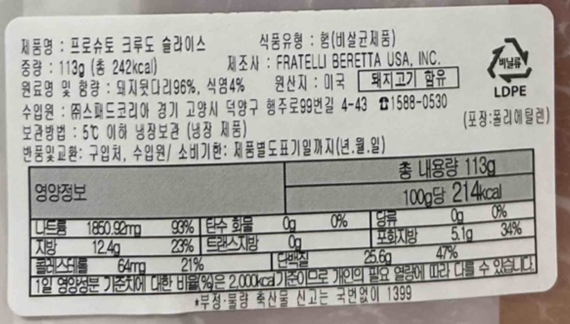 베레타 프로슈토크루도(슬라이스 113g/EA)