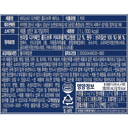 쟈뎅 바리스타콜드브루베이스(디카페인 1Kg/EA)