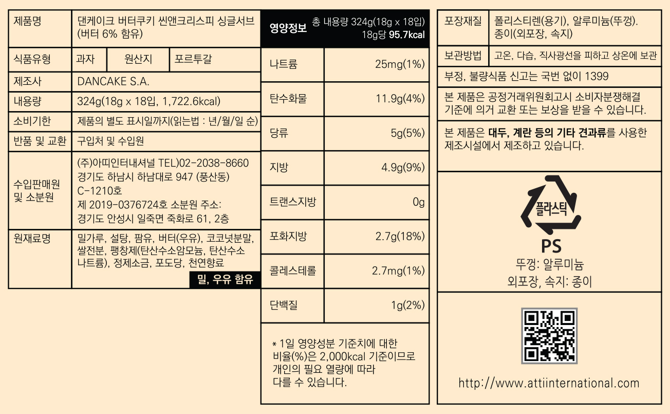 댄케이크 버터쿠키씬앤크리스피쿠키싱글서브(18개입 324g/EA)