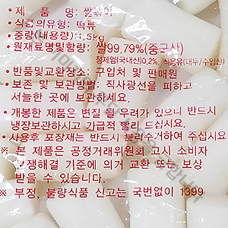 백미 쌀떡볶이떡(가래절단_중 1.5Kg/EA)