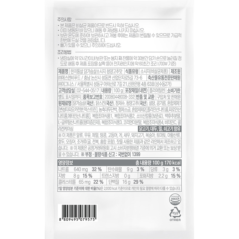 한끼통살 닭가슴살소시지(청양고추맛_100*160mm 100g/EA)