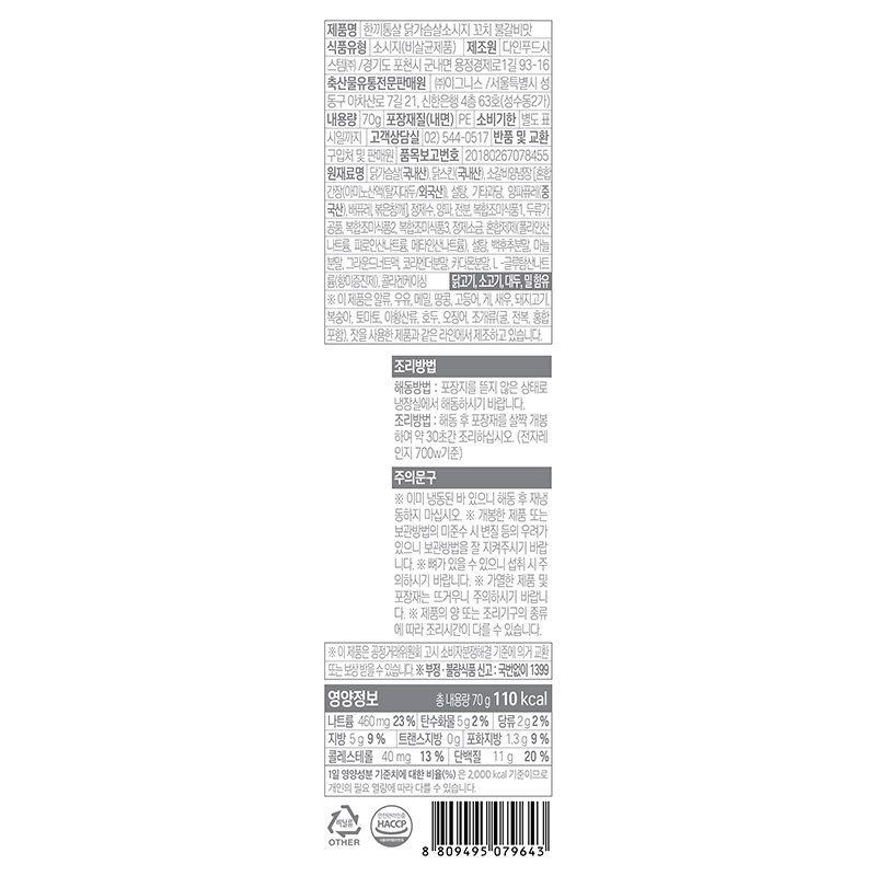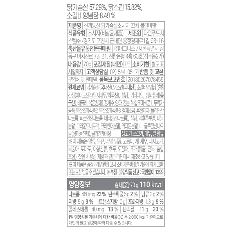 한끼통살 닭가슴살소시지꼬치(불갈비맛_63.3*215mm 70g/EA)