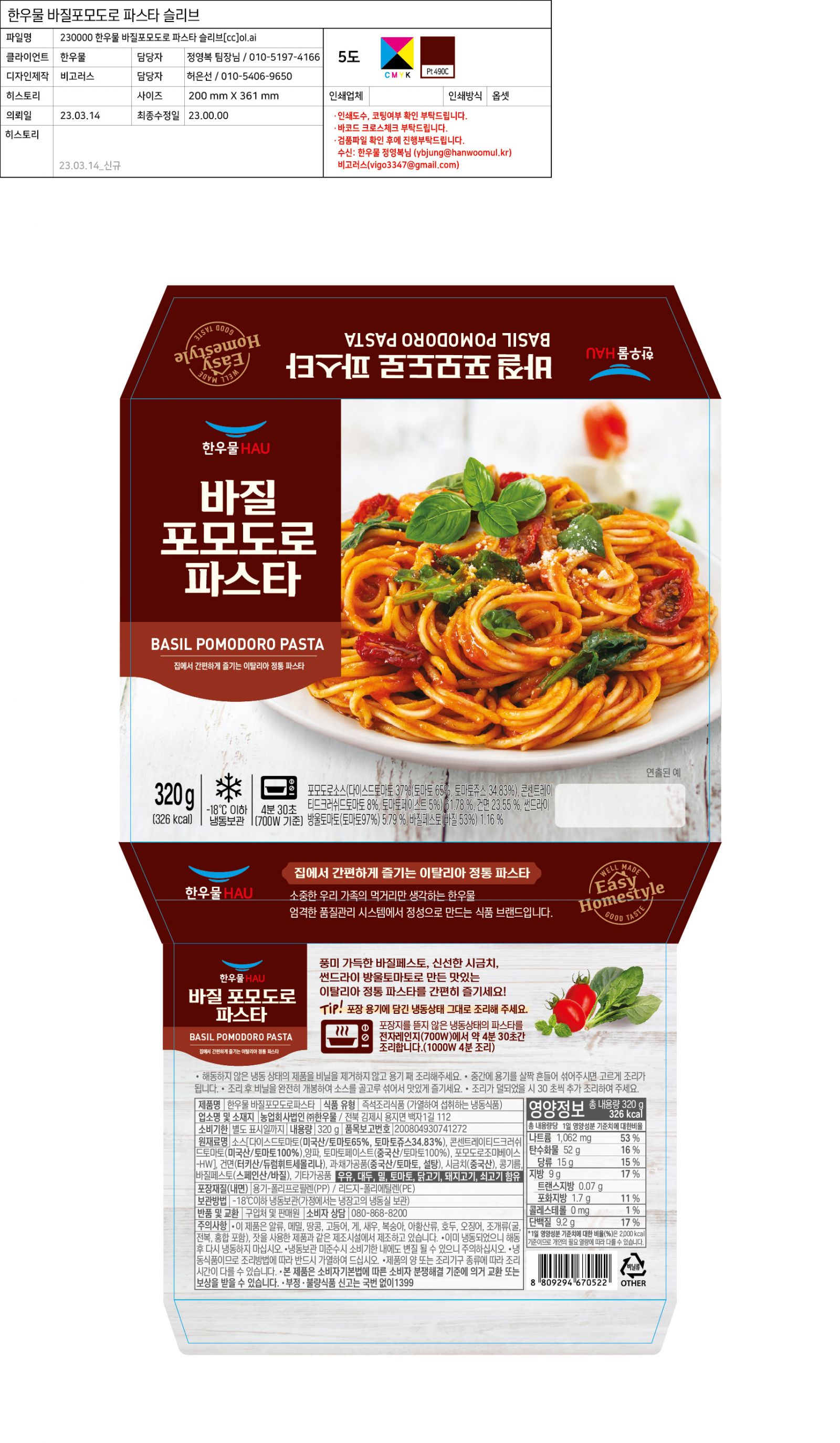 한우물 바질포모도로파스타(320g/EA)