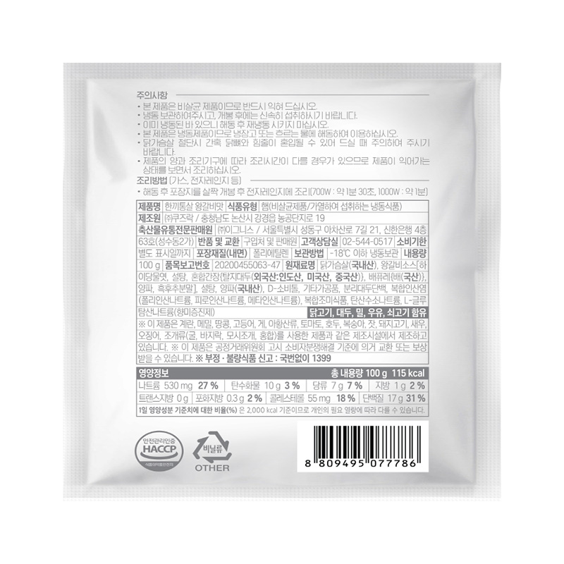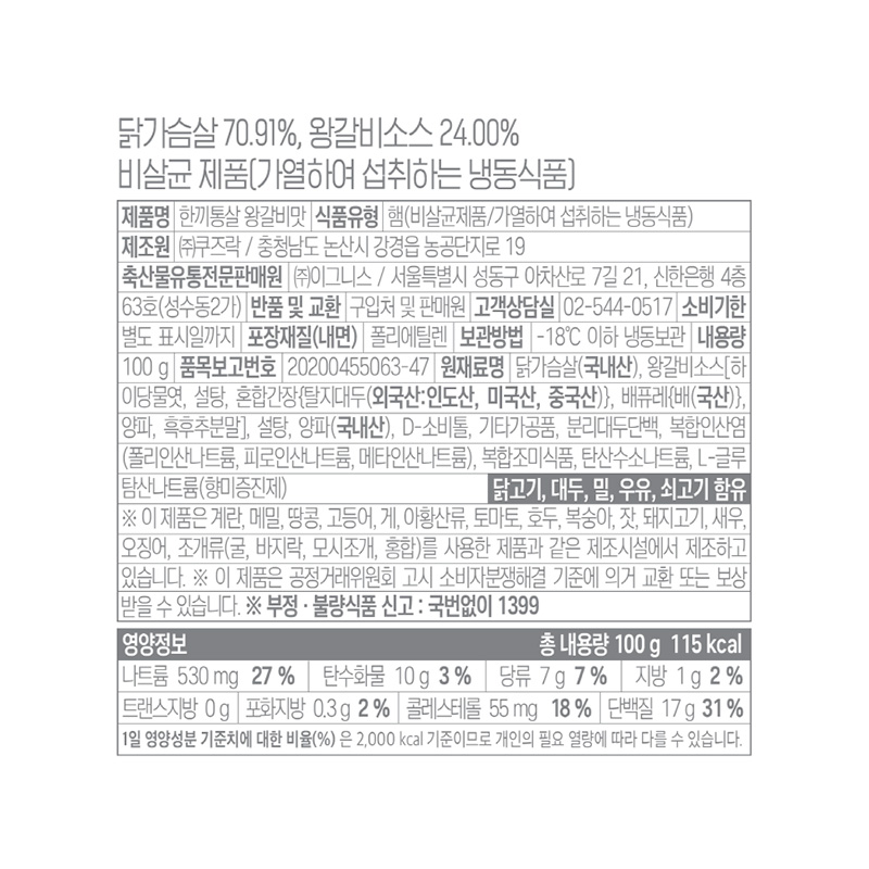 한끼통살 닭가슴살(왕갈비맛 100g/EA)
