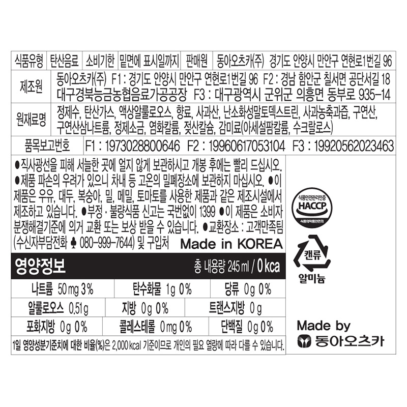 동아오츠카 나랑드사이다제로(캔_ZERO_그린애플 245g/EA)