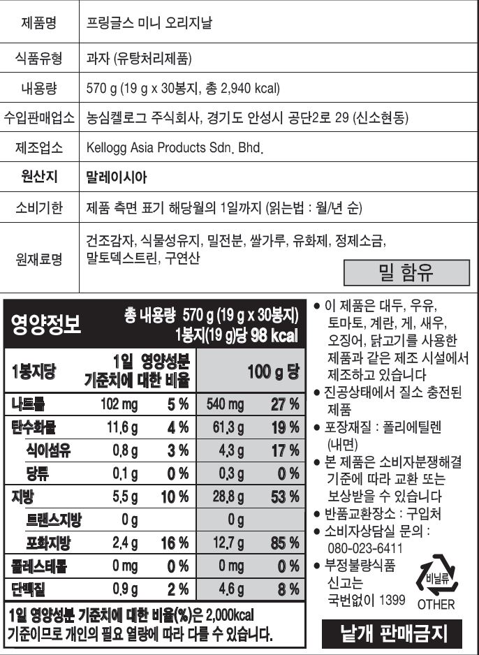 농심켈로그 미니프링글스(오리지널_19g*30개입 570g/BOX)