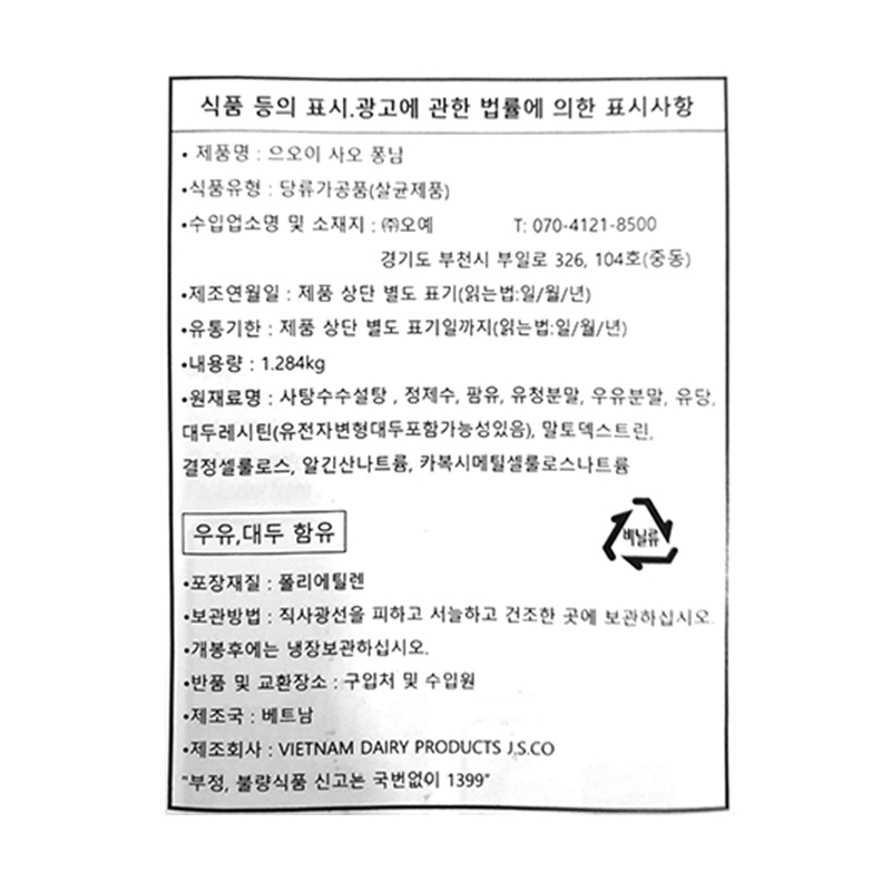 으오이사오퐁남(베트남연유_VINAMILK 1.284Kg/EA)