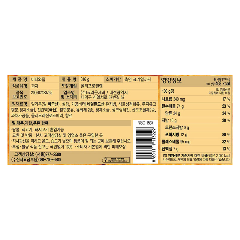 크라운제과 버터와플(316g/EA)