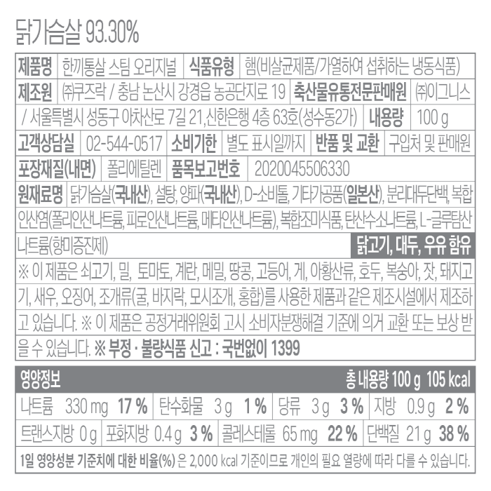 한끼통살 닭가슴살(스팀오리지널 100g/EA)