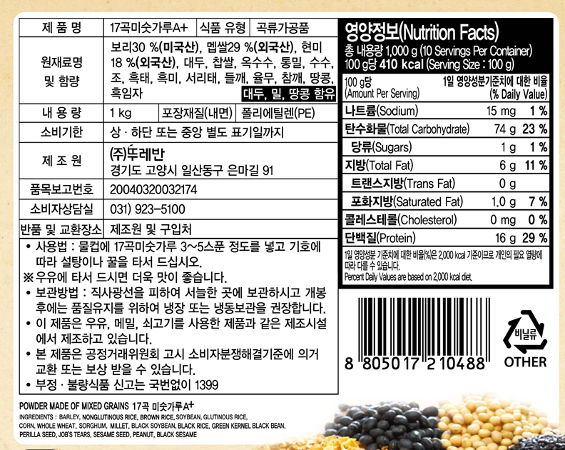 뚜레반 미숫가루(17곡 1Kg/EA)