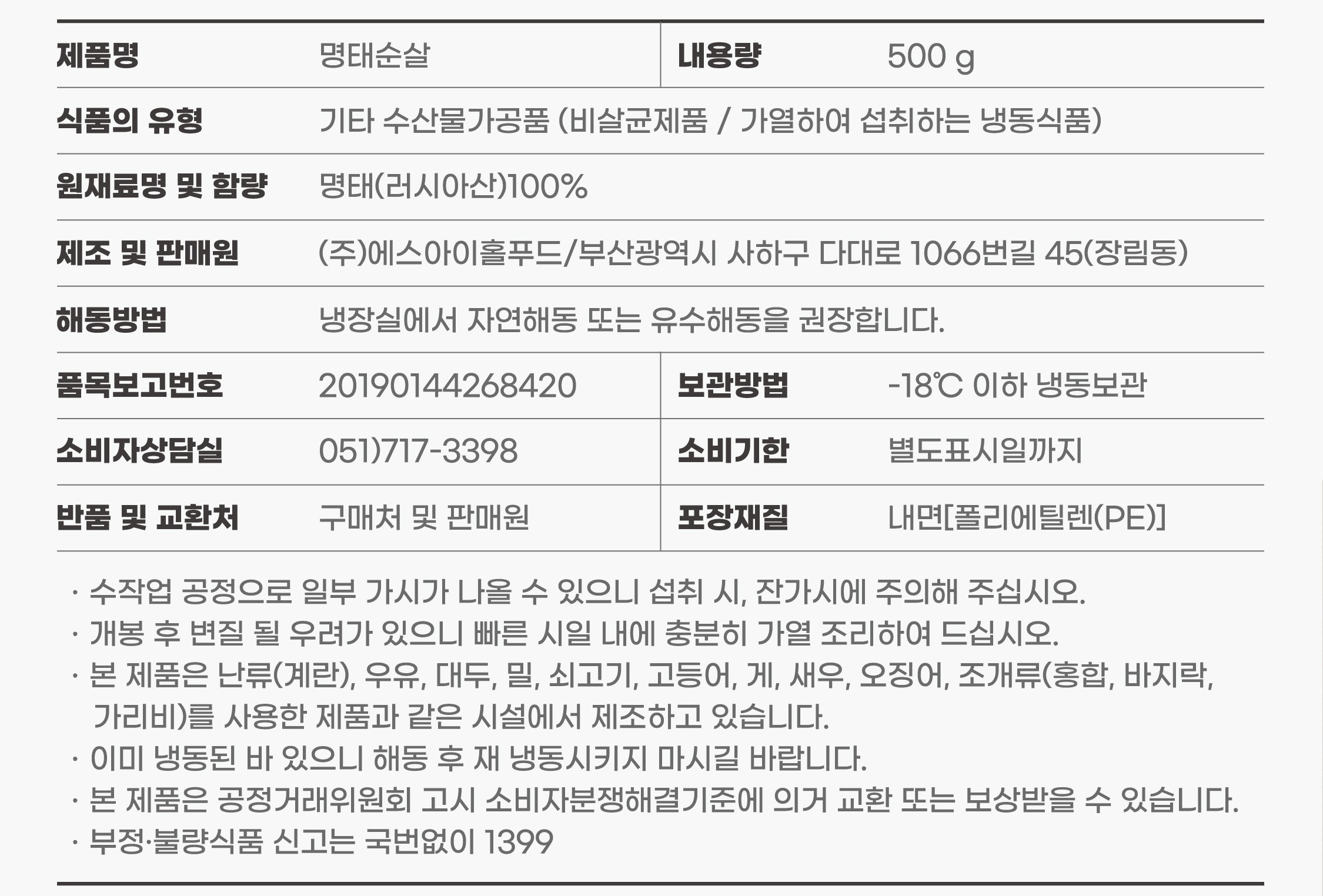 해슬로 명태순살(가시제거율99.9%_진공포장_2팩 강정용_전감용 500g/EA)
