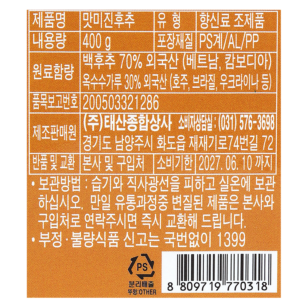 태산 맛미백후추분말(외식전용 400g/EA) 이미지