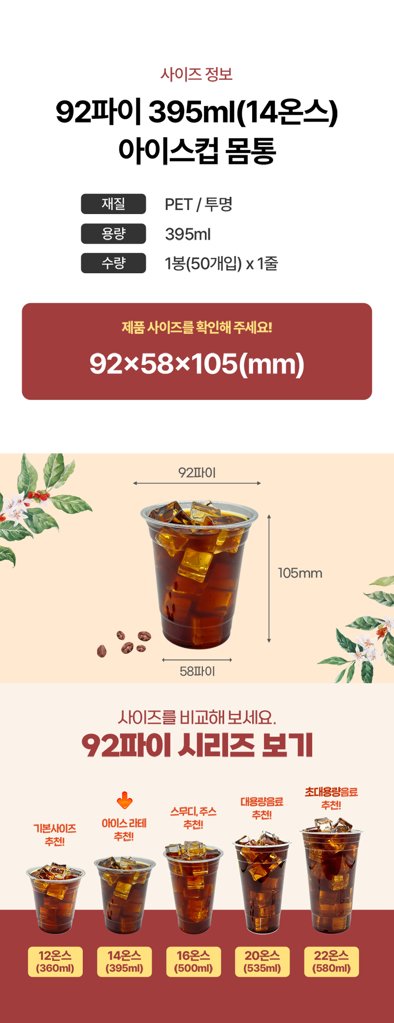 ★초특가★ 아이스컵 92파이 14온스 투명컵 50개 395ml 아이스컵 몸통 카페용 업소용 베이커리용