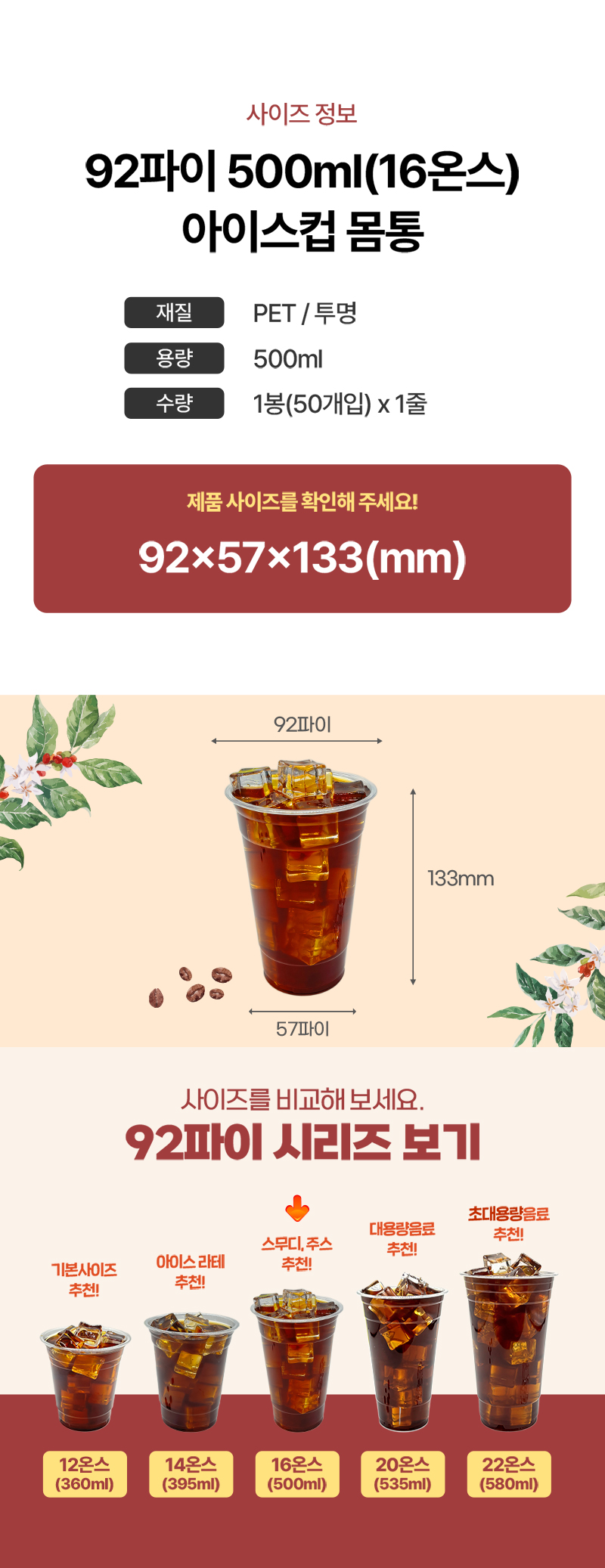 ★초특가★ 아이스컵 92파이 16온스 투명컵 50개 500ml 아이스컵 몸통 카페용 업소용 베이커리용 이미지