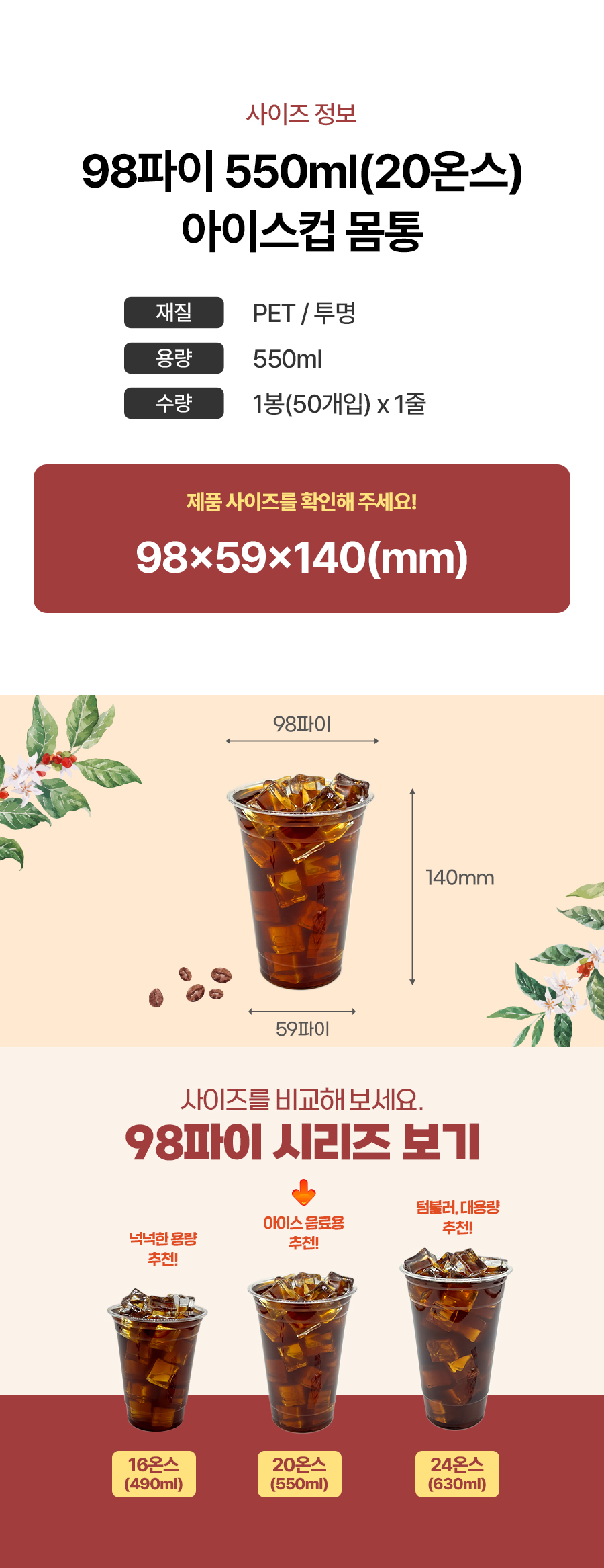 ★초특가★ 아이스컵 98파이 20온스 투명컵 50개 550ml 아이스컵 몸통 카페용 업소용 베이커리용
