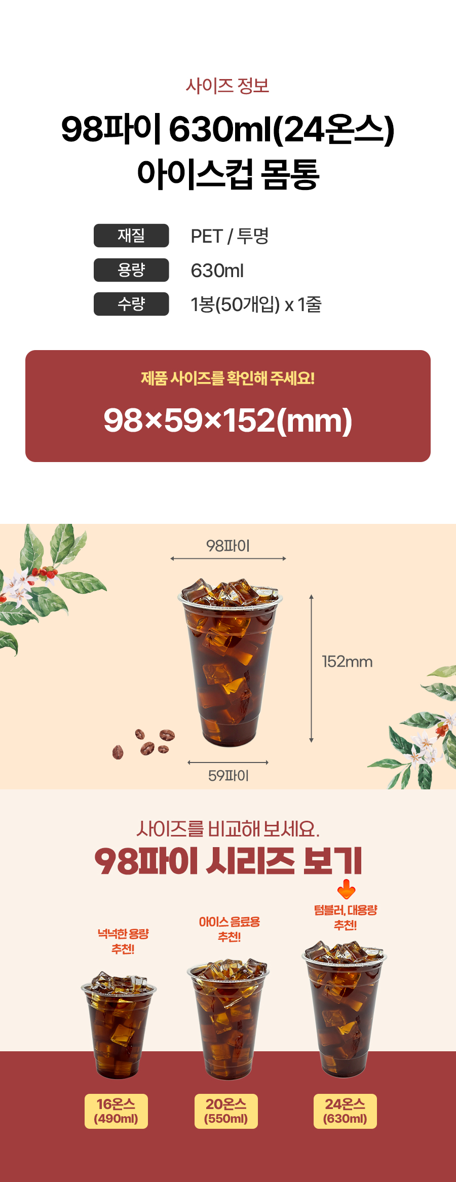 ★초특가★ 아이스컵 98파이 24온스 투명컵 50개 630ml 아이스컵 몸통 카페용 업소용 베이커리용