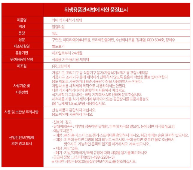 26-크린존)와이 식기세척기 전용세제 18L 이미지