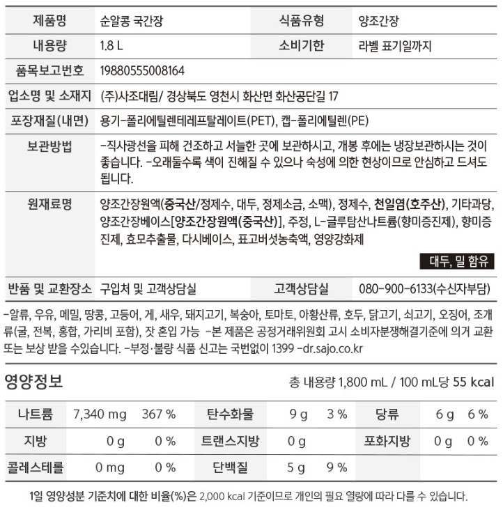 해표 국간장(1.8L_순알콩 1.8Kg/EA)