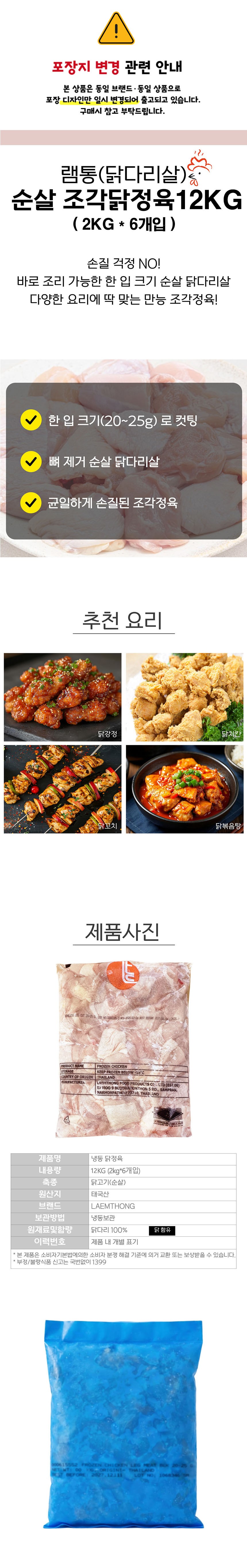 ★묶음 초특가★ 순살 닭조각정육 2kg X 6개입 램통 닭다리살 태국산 (20g/25g 내외 컷팅) 닭정육