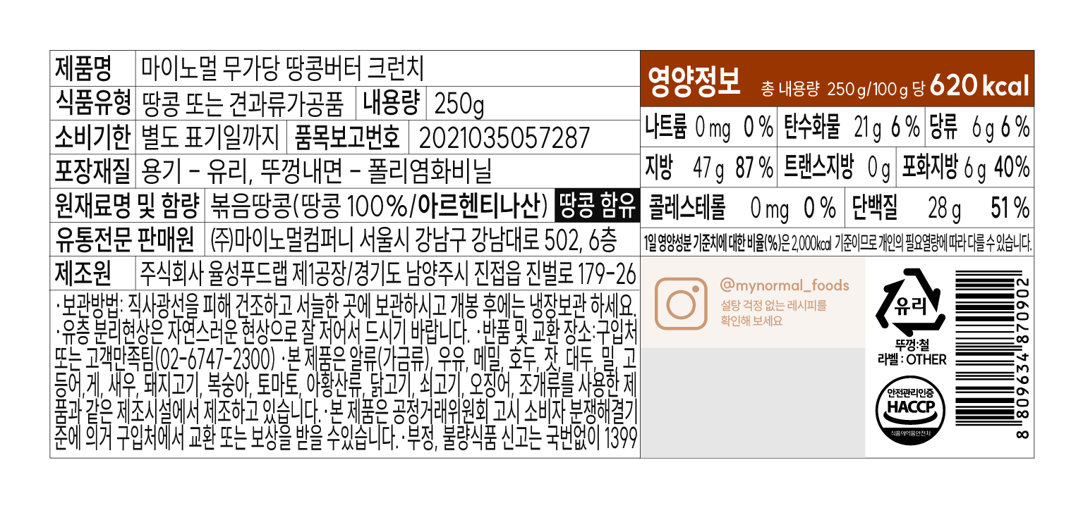 마이노멀 무가당100%땅콩버터(크런치_병 250g/EA)
