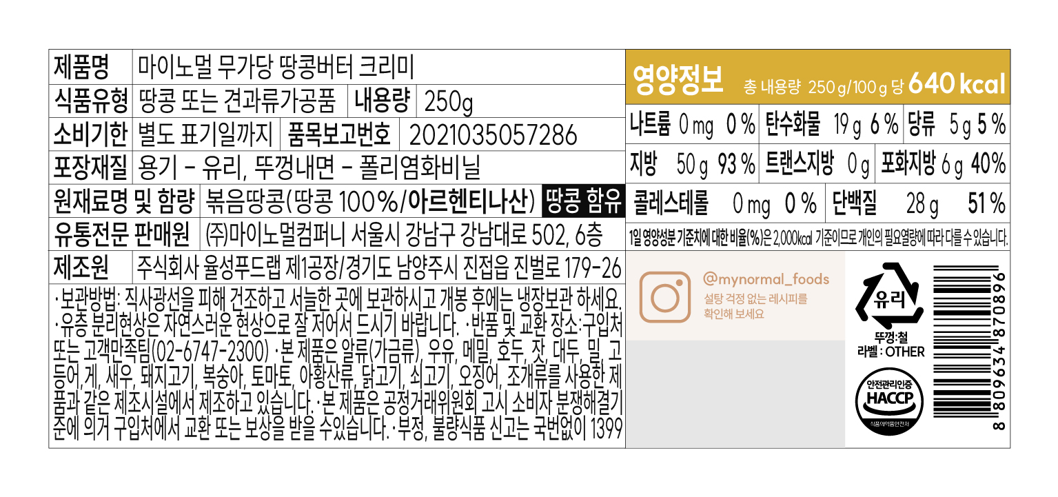 마이노멀 무가당100%땅콩버터(크리미_병 250g/EA) 이미지