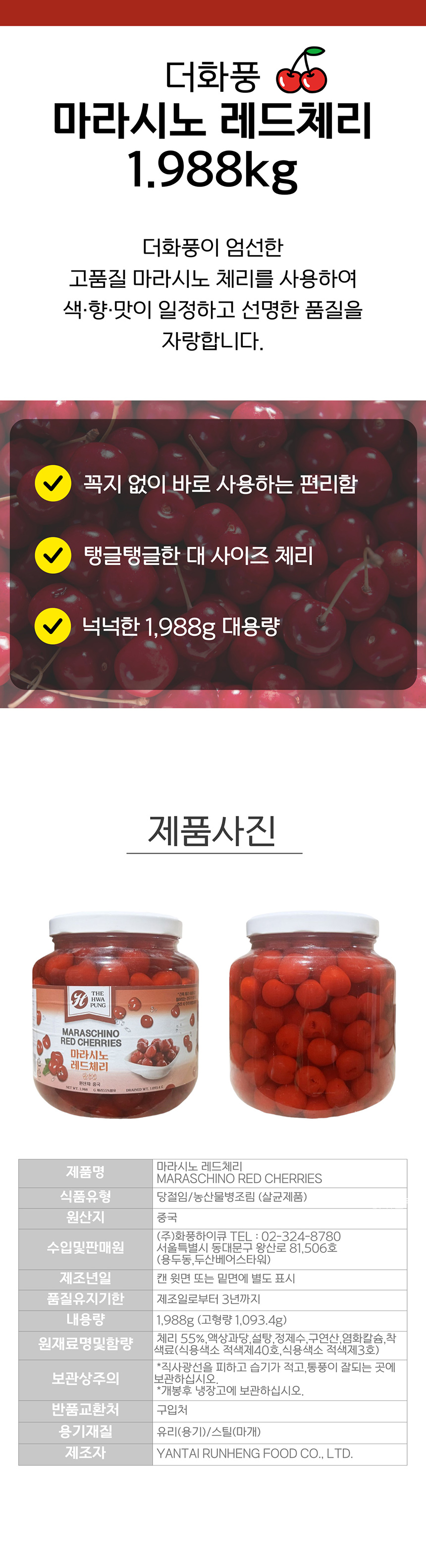 더화풍 적체리 1.988kg (대/꼭지제거) 체리통조림 절임체리 마라시노 레드체리