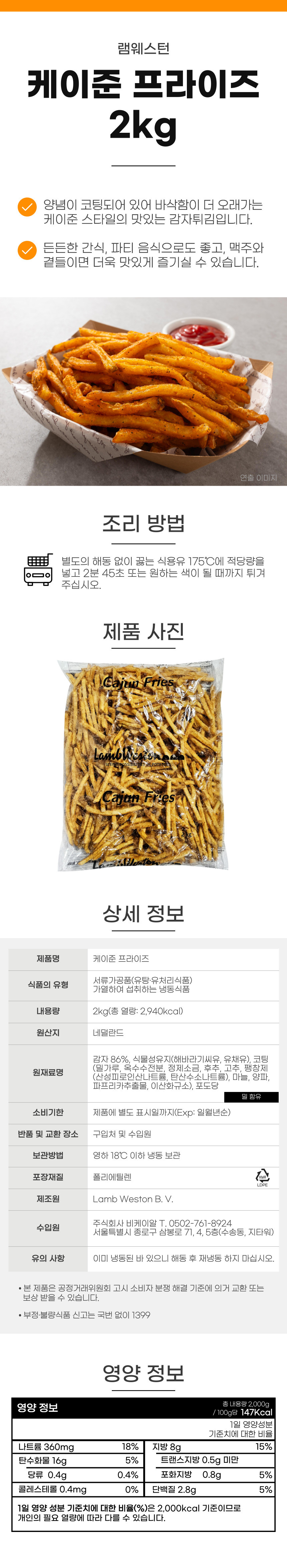 케이준 프라이즈 2kg 냉동 감자튀김 이미지