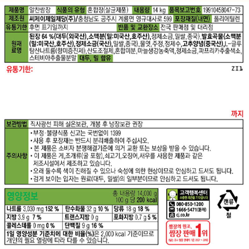 ★제당 초특가★해찬들 알찬 쌈장(14Kg/EA)
