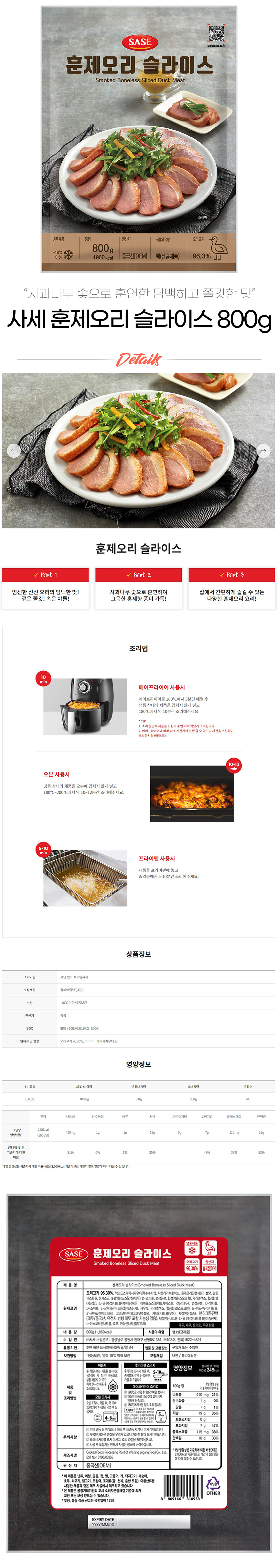 사세 냉동 훈제오리 슬라이스 800g