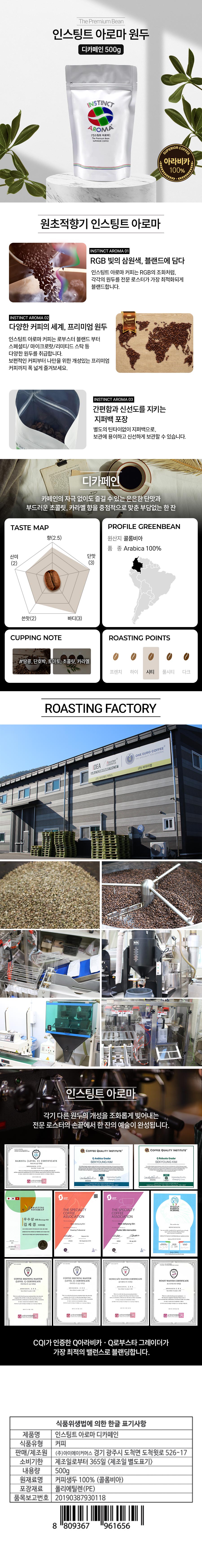 인스팅트아로마 원두커피(디카페인500g/EA 콜롬비아 아라비카100%)
