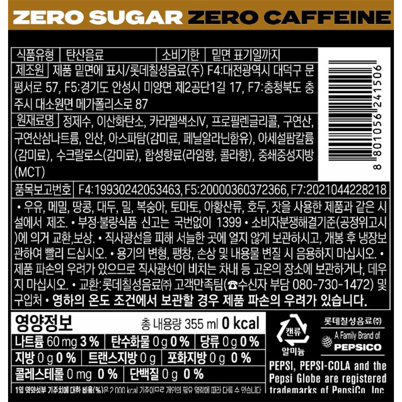 펩시 콜라라임향(355mlx24_제로슈거,제로카페인) 박스판매 이미지