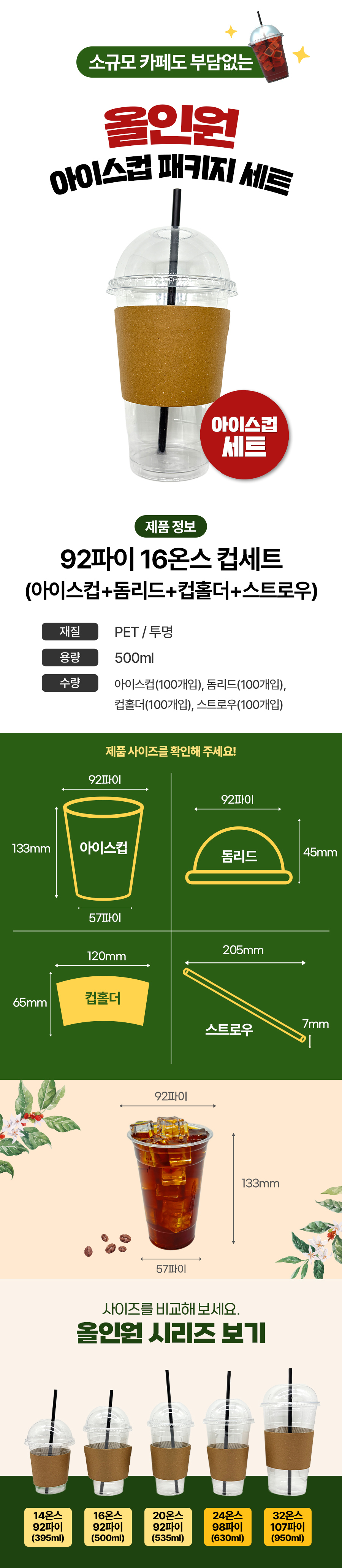★초특가★ 올인원 아이스컵 패키지 세트 100SET (92파이_16온스, 돔리드, 컵홀더, 스트로우) 500ml