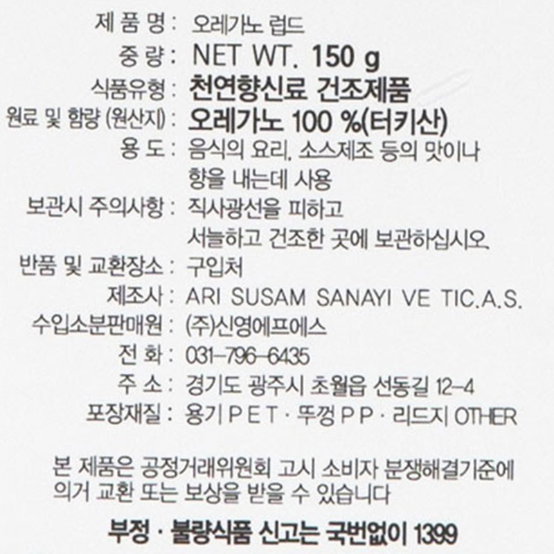 신영에프에스 오레가노(럽드/홀 150g/EA)