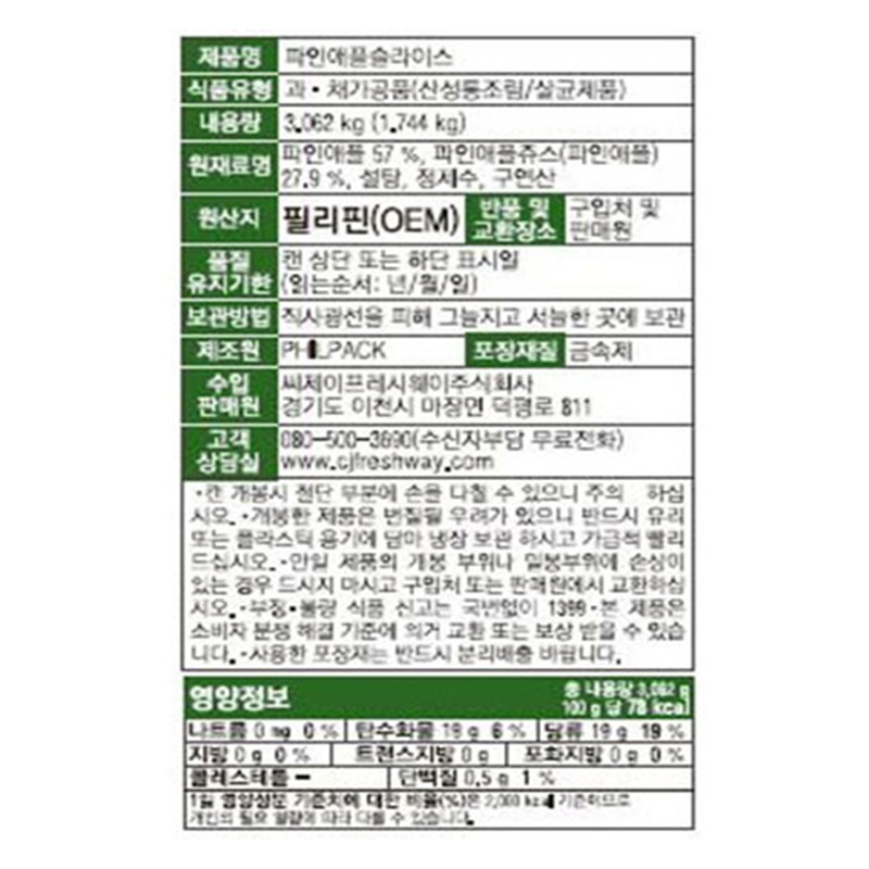 프레시원 파인애플캔(프리미엄 슬라이스 3.062Kg/EA)