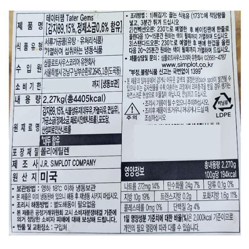 심플로트 냉동감자(테이터잼 2.27Kg/EA)
