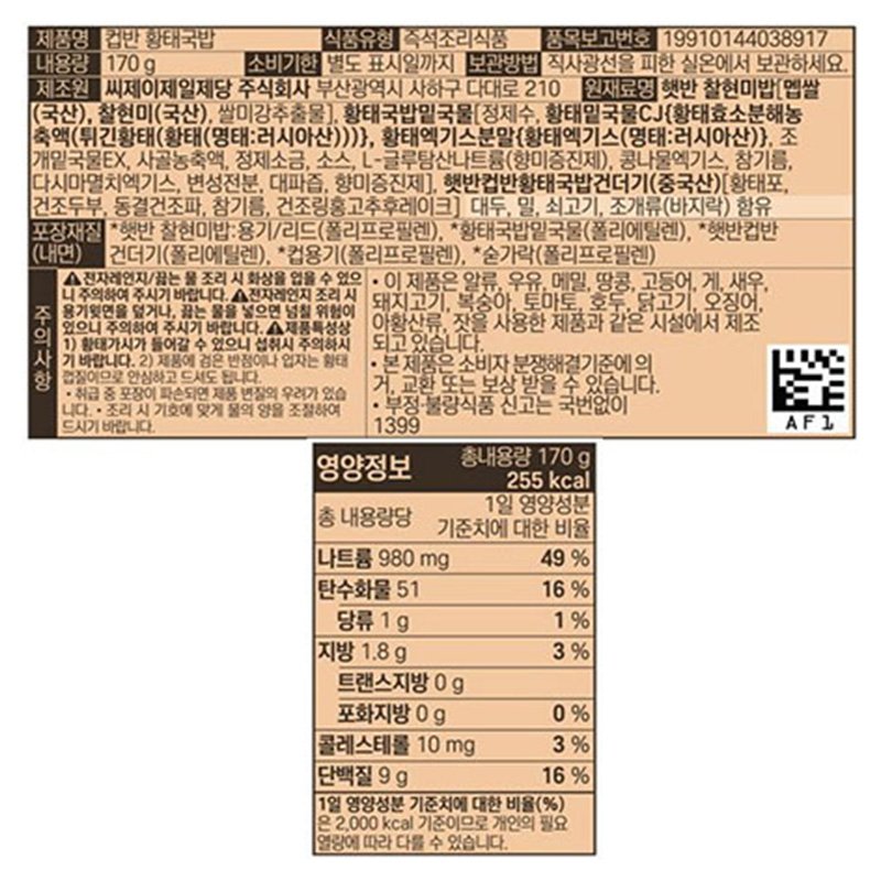 햇반 컵반(황태국밥_NEW 170g/EA) 즉석밥 컵밥