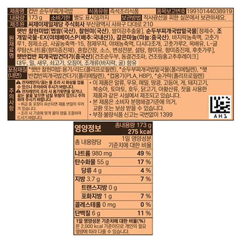 햇반 컵반(순두부찌개_NEW 173g/EA) 즉석밥 컵밥 이미지