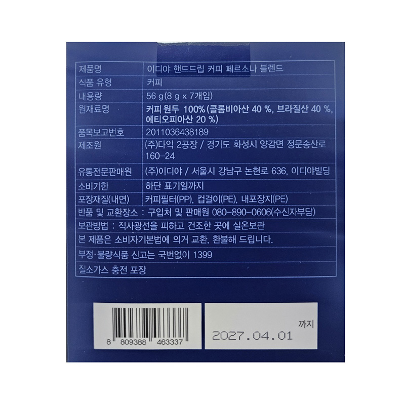 이디야 핸드드립(페르소나_블렌드_8g*7T 56g/EA)