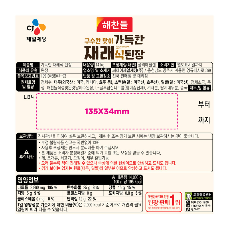 CJ제일제당 가득한재래된장(지함 14Kg/EA)