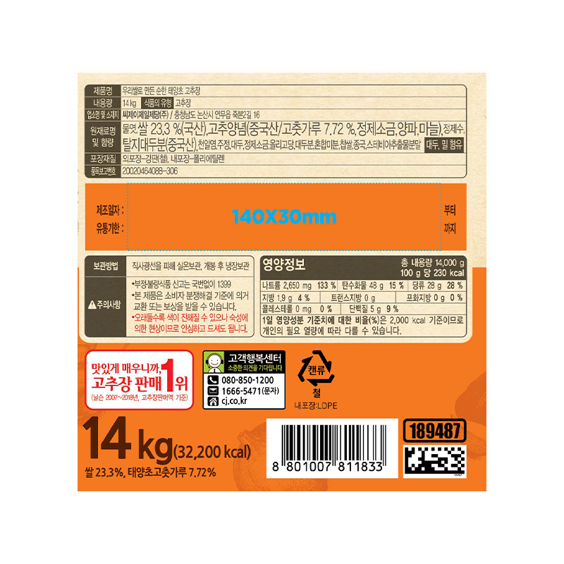 해찬들 우리쌀고추장(태양초_순한 14Kg/EA) 이미지