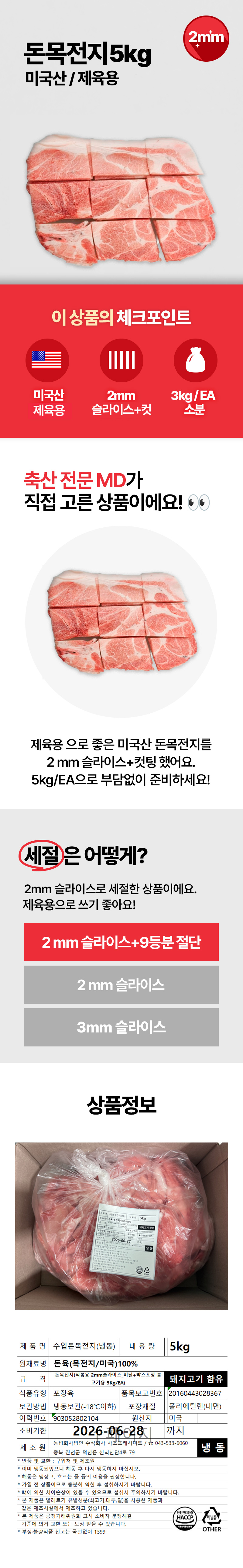 ♥kg당 7,290원♥ 제육용 돈목전지(미국산 냉동 2mm 슬라이스 6~9등분 5kg/EA) 제육 두루치기 목전지