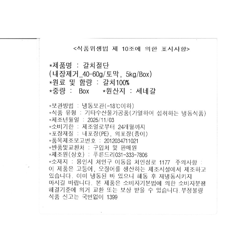 푸른드리 갈치(내장제거_40~60g/토막 5Kg/BOX)