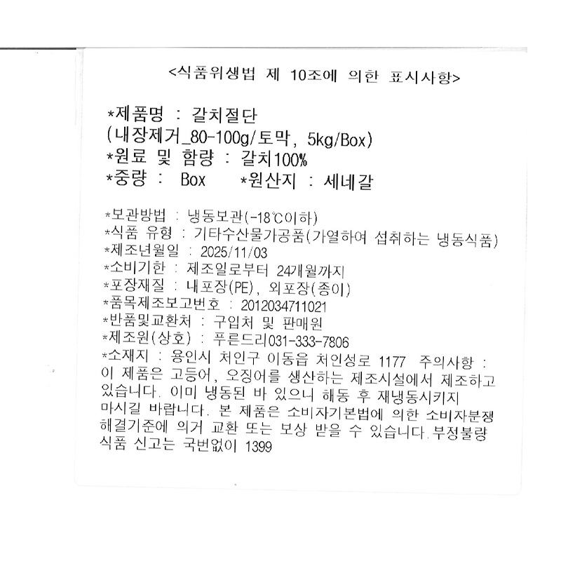 푸른드리 갈치(내장제거_80~100g/토막 5Kg/BOX)