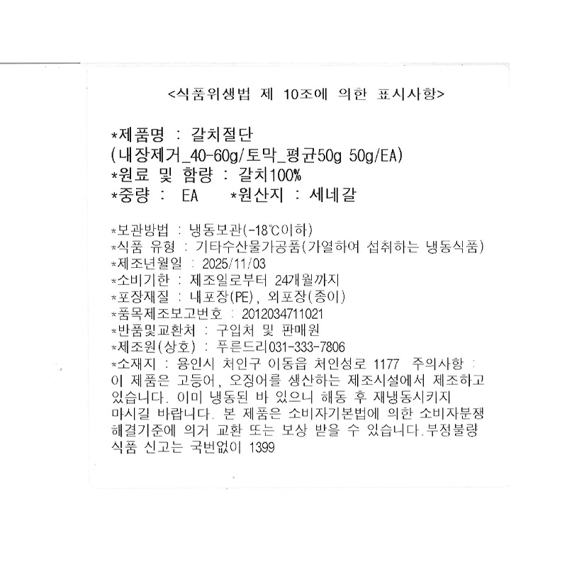 푸른드리 갈치(내장제거_40~60g/토막 50g/EA)