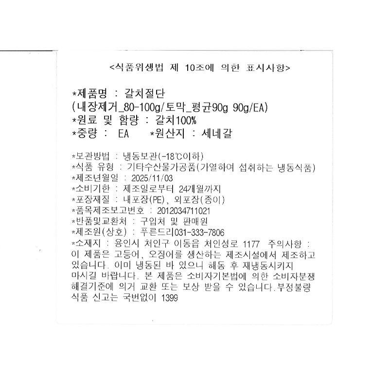 푸른드리 갈치(내장제거_80~100g/토막 90g/EA)