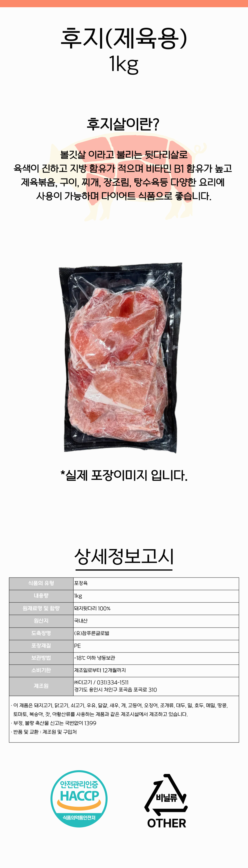 ★정육 특가★ 더고기 국내산 뒷다리살 1kg ( 2.5mm세절) 제육용 두루치기 후지 냉동