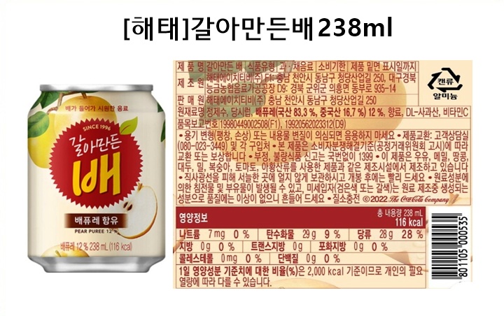 ![[해태음료]갈아만든배, 238ml, 24캔 /음료수/배음료/전통음료 이미지](https://content.foodspring.co.kr/vendor/2381/images/310_7815724301_r.jpg?f=webp&s=876x876&t=inside)