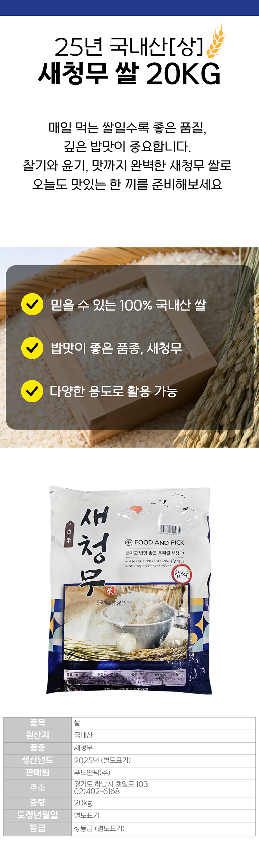 ★2만원 페이백★ [25년 햅쌀] 새청무 쌀 20kg [상등급,단일품종] 이미지