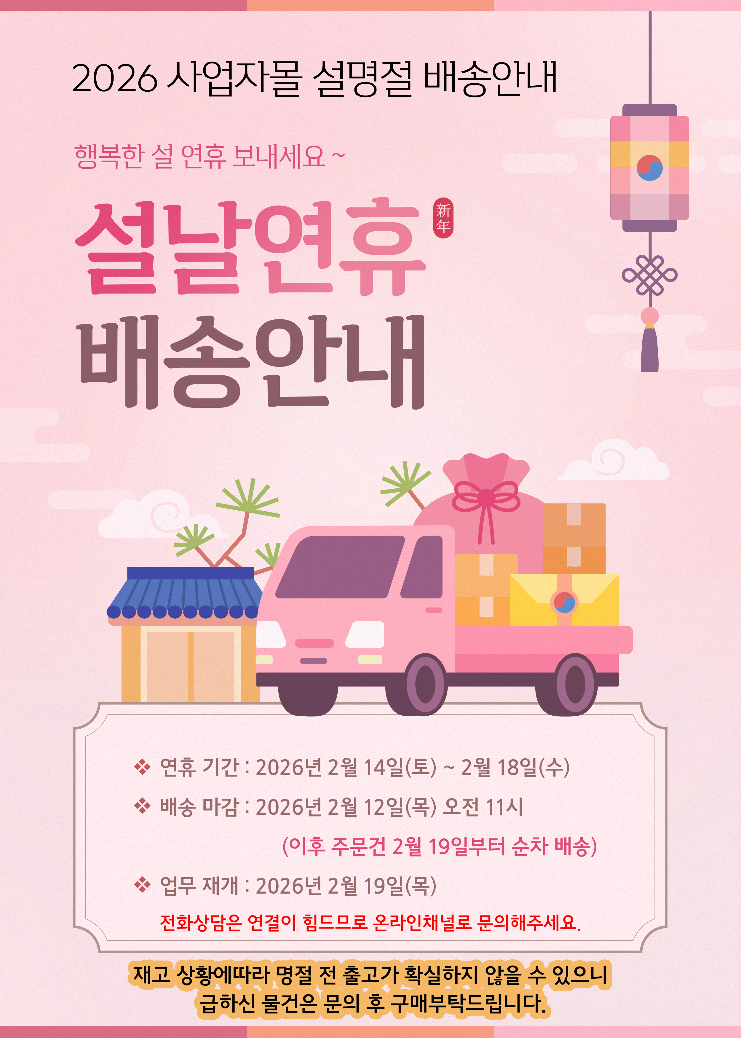 2/12 오전 11시 기준 냉장,냉동식품 발송 마감되었습니다. 이후 주문건 19일부터 순차적으로 출고됩니다.